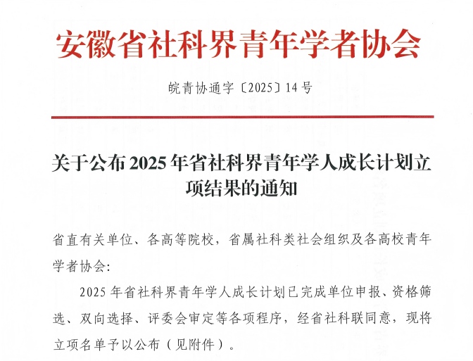 近日,安徽省社科界青年学者协会正式公布了2025年“省社科界青年学人成长计划”立项结果,我校经济与管理学院青年教师徐艺博士成功入选,实现了我校在该项目上的突破。“省社科界青年学人成长计划”是由省社科联指导,青年学者协会组织实施的重要人才培养项目,旨在选拔并扶持一批具有发展潜力的优秀青年社科人才。该计划经过严格遴选,最终确定立项名单。项目包含“专项课题研究”与“高级别课题申报书指导”两大模块,并为每位入...