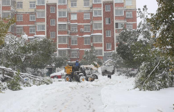 图十:工人正在用铲车清除路上被雪压断的树枝