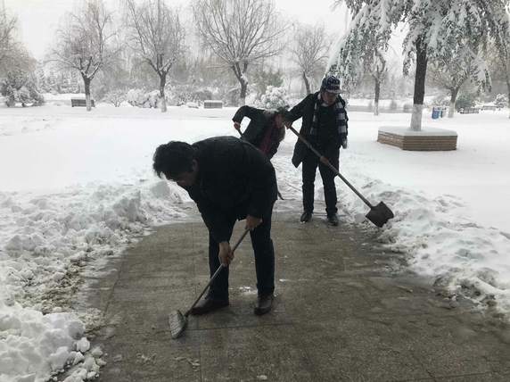 图二: 艺术设计学院的老师们逐渐在楼前铲扫出一条干净的小路