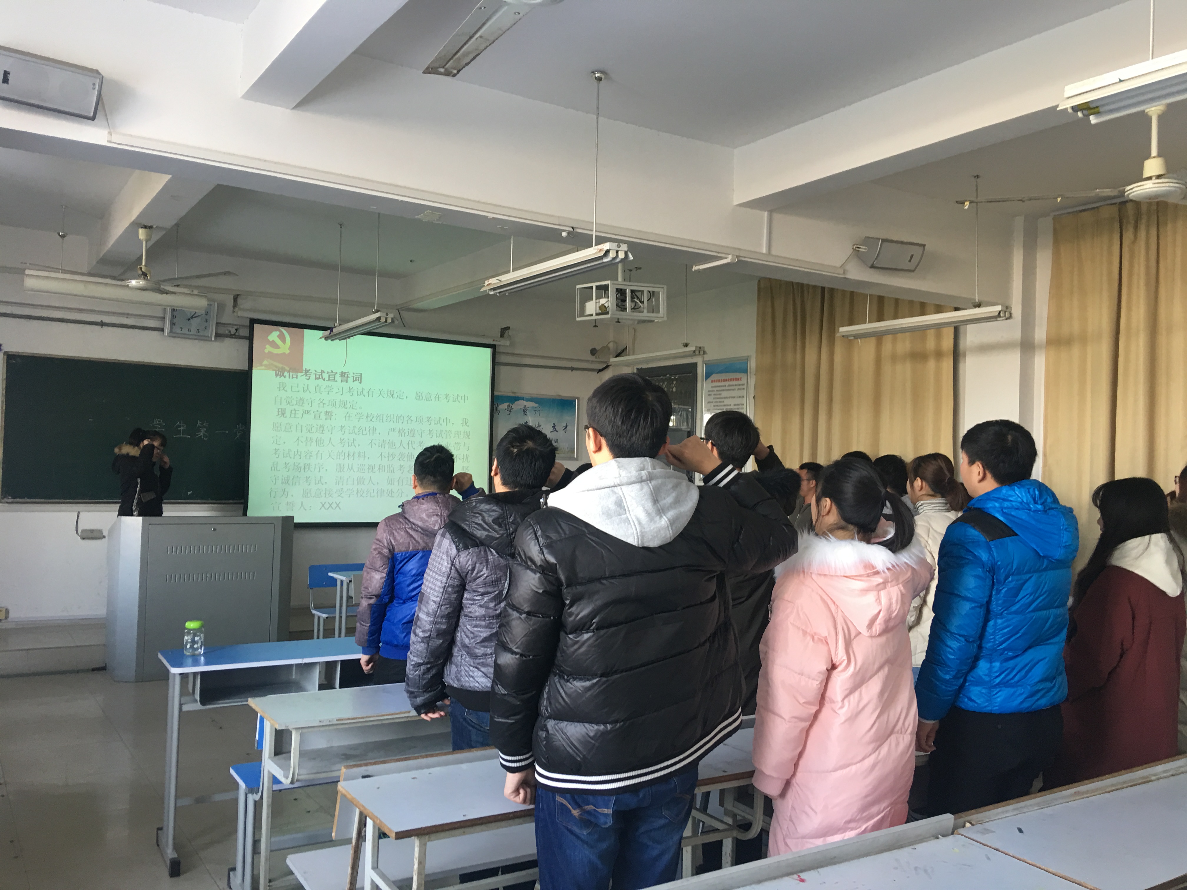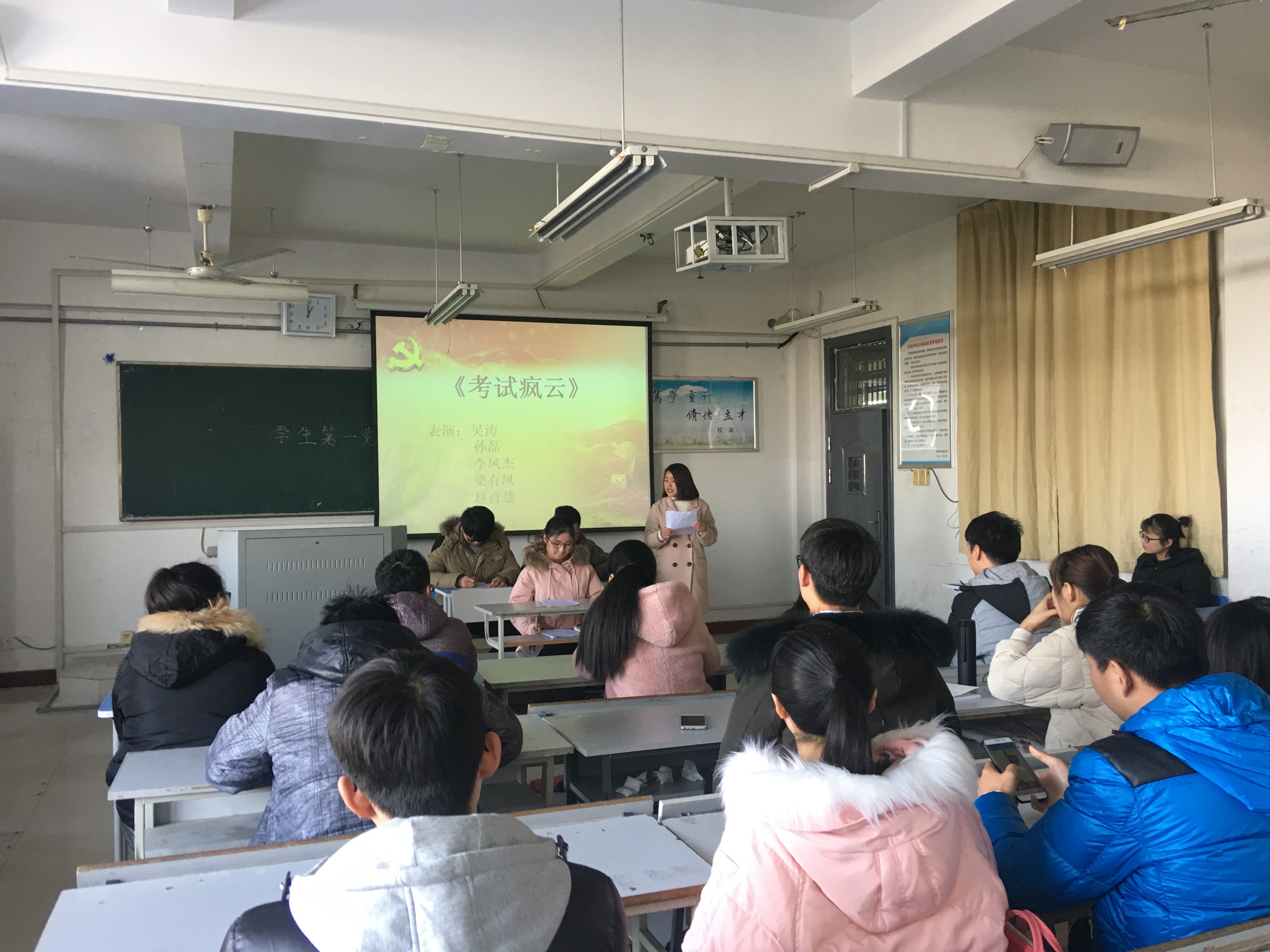 会上,刘鑫教育学生党员在期末考试中应当以身作则,诚信考试,养成良好的考试风气,培育良好的学风。学生党员张妮带领支部成员学习《蚌埠学院学生手册》的部分条例,讲述诚信考试的重要性和必要性。在知识竞答环节中,同学们围绕考试制度方面的题目,纷纷举手抢答,在热烈的氛围中重温有关诚信和教育方面的相关知识。非毕业班的学生党员们自编自导自演的话剧《考试“疯”云》,为党日活动掀起了小高潮,让大家在欢乐的氛围中学习了诚信考试的相关规则,同时也加强了对党员的思想教育。最后,张妮带领支部成员全体起立进行诚信考试宣誓,让诚信的种子在同学们的心中生根、发芽、开花、结果。