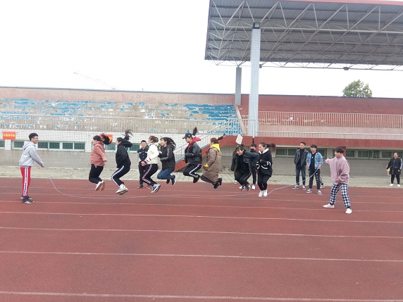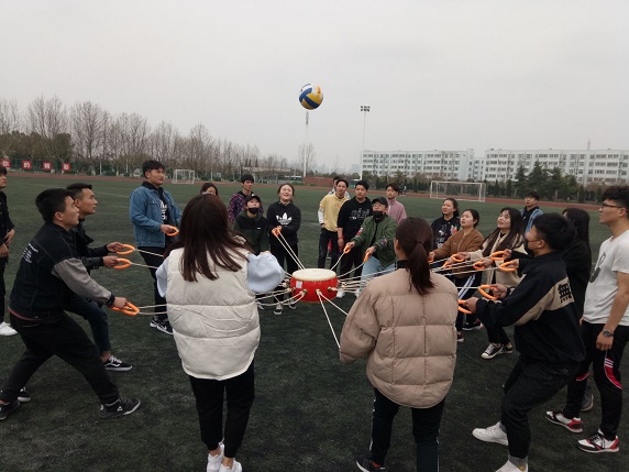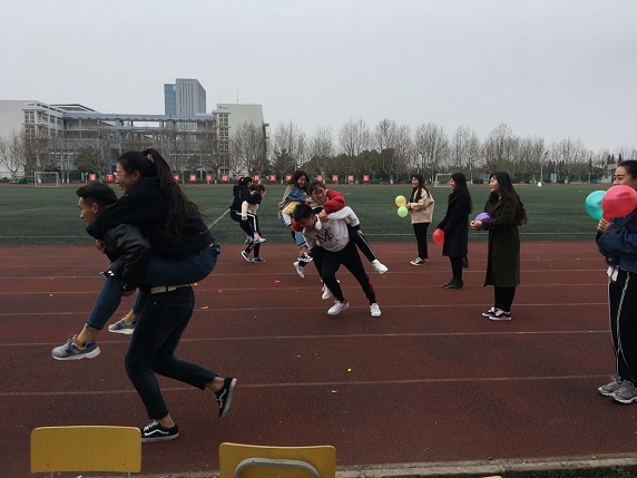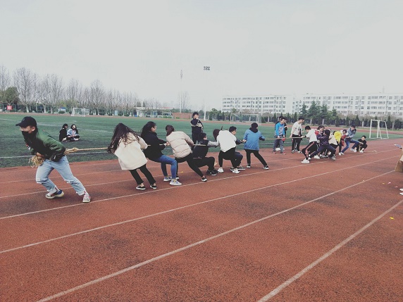 “夹球跑”活动瞬间把大家拉回美好的童年生活,在规定的区域内,随着哨声的响起,双方十人两两合抱以迅雷不及掩耳之势,跑到终点后挤爆气球,喝彩声欢笑声响彻田径场。跳大绳中,在规定的时间内,同学们身影矫健,依次而入,鱼贯而出,宛如游龙。抢凳子和背人跑中,同学们自信飞扬,既有你争我抢,又有团结协作;有的助威呐喊,有的积极参与。一项传统的趣味运动赛“两人三足”深受同学们的喜爱。各队学生分成两人一组,把一人的左脚和另一人的右脚牢牢拴在一起,两个人撒开三条腿拼命往前跑,既要跑得稳又要跑得快。刚开始,同学们都信心满满,准备大显身手。但是有些同学由于缺少默契,步调没有做到协调一致,不幸摔倒在地上。然而摔倒的同学并没有放弃比赛,而是通过相互沟通渐渐找到了默契。在相互鼓励、团结协作之下一起奔向了胜利的终点。“拔河”比赛使运动会达到了高潮,绳的两端是力量的对决,选手们使出浑身力气,寸尺不让,热汗直流,各拉拉队的加油声欢呼声一浪高过一浪。最后一项同心鼓游戏中,面对不同心的难题,众人相互磨合,相互调整,心往一处想,劲往一处使,眼往一处看,随着球的起落起伏,现场只能听到球一声声在鼓中央自由落体的声音,就像是一首动听的歌。整个赛场充满了青春的气息和活力。