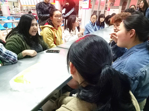 “English Corner”英语角活动是外国语学院加强学风建设举办的常规性活动,每周二晚上7:00在第二学生食堂举办。经过前期的宣传和准备,27日当晚,同学们早早来到第二学生食堂,围绕在外教Neri身边。Neri让大家谈谈“2018年的新愿望”,同学们积极踊跃,大胆表达。外教Neri态度和蔼,循循善诱,耐心听取同学们的表述,并帮助他们改正语法和语音表述上的错误。在外教的指导和同学们的带动下,部分性格内敛的同学也尝试开口,大胆表述,现场气氛热烈。来自17翻译班的王雪迎同学说:“我们的英语学习大多处于被动接受的状态,但真正的英语应用却需要语言的转换与表达,所以我们迫切需要类似英语角这样的平台提升我们的语言输出水平。”