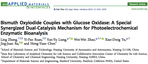 利用浸渍羟基化法在NiO电极表面原位制备了BiOI纳米片,再在该p型BiOI/NiO/ITO异质结电极表面组装葡萄糖氧化酶,该工作提出了基于双催化过程的光电化学酶传感模式。BiOI不但可以充当光电活性物质,还同时起着过氧化物模拟酶的作用,能快速催化葡萄糖氧化酶催化底物产生的H2O2,使得体系的阴极电流增加,从而实现高灵敏的酶传感。该成果“Bismuth Oxyiodide Couples with Glucose Oxidase: A Special Synergized Dual-Catalysis Mechanism for Photoelectrochemical Enzymatic Bioanalysis”于近期在ACS Applied Materials & Interfaces上发表【ACS Appl. Mater. Interfaces 2018, 10, 3372】。