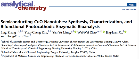 最近,张玲还制备了一种窄禁带宽度的CuO NTs/Cu电极,发现该电极除了具备有利于生物分子负载与信号传导的阵列结构以外,还具有类似过氧化物酶的催化特性。基于CuO NTs和黄嘌呤氧化酶(XOD)的双酶催化机制成功实现了鸟嘌呤的光电化学传感。该工作为其它仿生酶催化剂在PEC传感中的应用及相关信号传导机制提供了新视角。该成果“Semiconducting CuO Nanotubes: Synthesis, Characterization, and Bifunctional Photocathodic Enzymatic Bioanalysis”于2018年4月2日在Analytical Chemistry上在线发表(Anal. Chem. 2018, DOI: 10.1021/acs.analchem.8b00742)。