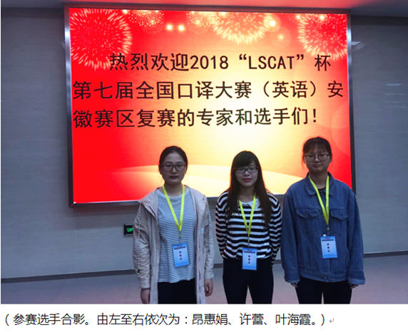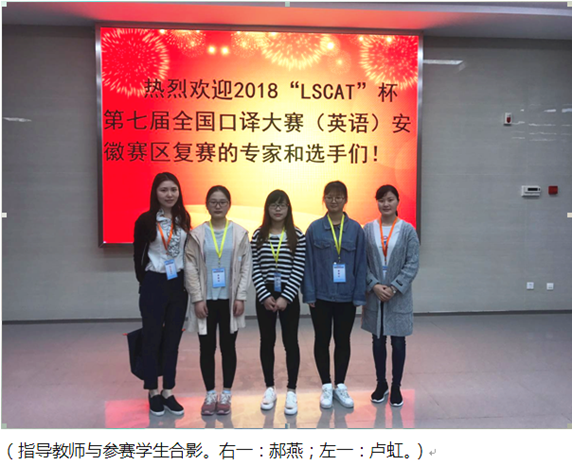 2018年4月22日,由中国翻译协会主办,安徽省外国语言文学学会,合肥工业大学外国语学院以及安徽译创语言服务有限公司承办的第七届“LSCAT”杯全国口译大赛(英语)安徽省复赛于合肥工业大学翡翠湖校区落下帷幕。此次比赛面向全省各高校共119名学生,设英译汉和汉译英两个环节,主要考察学生的信息传达与技术运用能力以及口译职业素养。蚌埠学院外国语学院学生昂惠娟、许蕾与叶海霞不畏强手,从容比赛,获得三等奖。参赛指导教师郝燕和卢虹也获得了优秀指导教师奖。蚌埠学院外国语学院院长石平应邀担任本次赛事评委。