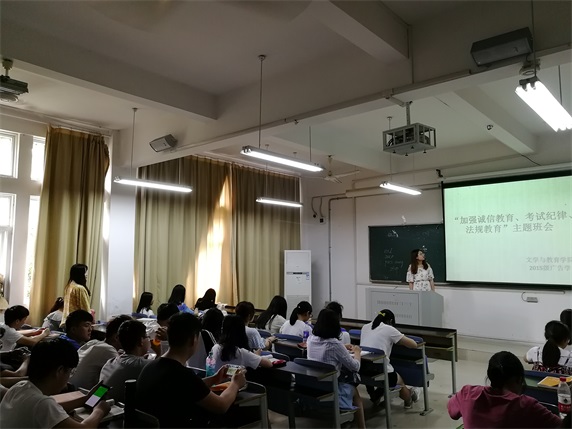 第三,文学与教育学院组织在校生各班级于6月1日至5日间陆续开展“加强诚信教育、考试纪律、法规教育”主题班会,弘扬诚信考试光荣,违纪舞弊可耻的社会风尚,重点学习蚌埠学院《学生手册》的有关内容和《国家教育考试违规处理办法》《教育法》(第79条、第80条)、《中华人民共和国刑法(修正案九)》中的有关内容,教育每一位同学自觉抵制违纪作弊行为,在高考期间、四六级考试、普通话考试、期末考试中严格要求自己,包括在教师资格证考试、驾照考试等各种考试中也绝不当“枪手”,也不找“枪手”替考,严守纪律,严守法规,做诚实守纪的好公民,做有理想、有道德、有文化、有纪律的“四有”青年,为树立良好的学风和校风做出自己的贡献,用真才实学服务于社会,服务于新时代。(撰稿:潘兰香;编审:黄灿 袁飞)