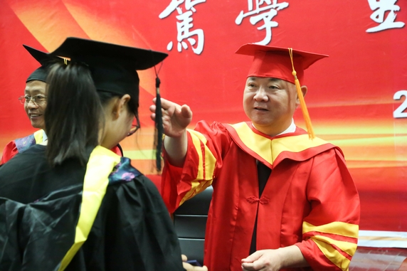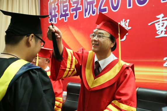 在激昂的进行曲中,本科生们依次列队上台,行隆重的拨穗正冠之礼,师长们为毕业生颁发毕业证书,并扶正流苏授予学士学位。