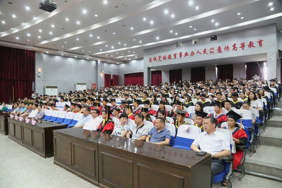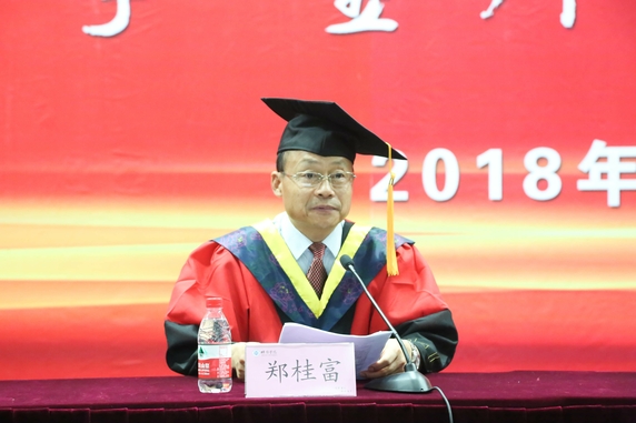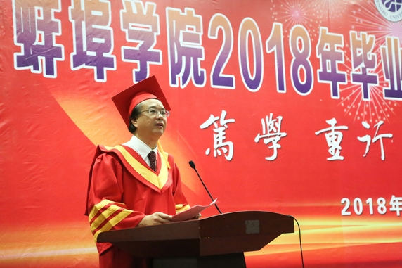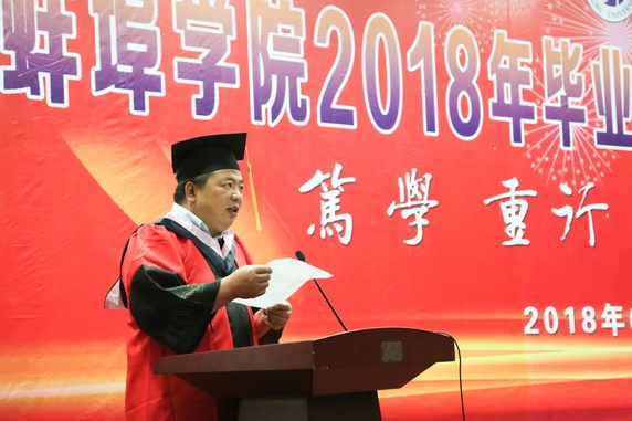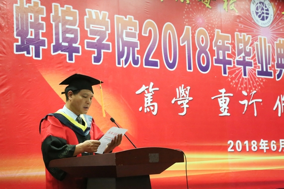 在热烈的掌声中,校长丁明代表学校向即将走向美好未来的毕业们送上最温暖的祝福,向悉心指导他们的老师表示最衷心的感谢!对于即将走出校门、从蚌院学生变成蚌院校友的同学们,丁明以师长的身份勉励大家:一是不要忘记学习。在这样一个新时代,“怀才不遇”的机率很小,但前提是你要怀才。在投身这个伟大时代的同时还要知道这是一个知识飞快折旧的时代,一个本领恐慌的时代,今天拿到的证书,并不代表你拥有面对未来的能力。希望同学们不要忘记学习,向书本、社会学习,把终身学习作为一种信仰,才能真正拥有面对挑战时的从容,才能真正拥抱这个伟大的时代;二是不要忘记行动。在这样一个新时代,“能够做”的空间很大,但前提是要去“做”。“道虽迩,不行不至;事虽小,不为不成”,每一项事业都是脚踏实地干出来的,哪有什么云淡风轻,只不过别人负重前行。要拿出不达目的誓不罢休的实干精神,怀揣梦想,务实重行,在实现中国梦的征途中绽放青春的芳华和生命的精彩;三是不要忘记担当。在这样一个新时代,“应该做”的事情很多但前提是你有没有担当。“知责者,大丈夫之始也”,希望毕业生们能懂得这个时代赋予的责任,把握时代脉搏,肩负起国家和民族的希望,在实现中华民族伟大复兴中国梦的新征程中谱写自己的精彩人生、幸福人生;四是不要忘记母校。丁明表示学校会加快建设、锐意发展,以更好的未来再遇到更好的你们。最后,他祝愿毕业生前程似锦、一生平安,并引用泰戈尔的诗,“无论你走的多么远,你的心总和我连在一起;无论黄昏的时候,树影多么长,它总是和树根连在一起”,向毕业生表达了深深的不舍。