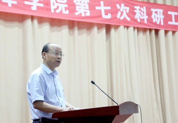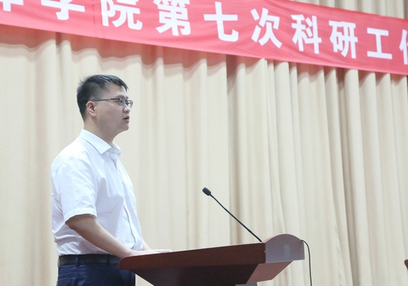 副校长郑桂富在会上作题为《提升能力,压实任务,聚焦地方经济社会发展,开创我校科研工作新局面》的报告。报告从“高层次项目立项取得突破”“论文、专利数量与质量稳中有升”“学科建设步伐加快”“科研平台建设取得成效”“科研团队建设稳步推进”“科研管理制度进一步完善”“服务社会能力逐步增强”“哲学社会科学工作成效明显”“大学生科技创新能力不断提升”“学术交流活动有序开展”等十个方面总结回顾了第六次科研工作会议以来我校科研工作取得的主要成绩,同时指出对照建设地方应用型高水平大学的战略目标和“十三五”教育事业发展规划确定的各项指标,仍存在的问题和不足。报告对下一步科研工作进行了全面部署,提出要以制度建设为保障,不断强化政策的激励和引导作用;以平台建设为引领,力争实现省内一流学科建设的突破;以团队建设为关键,为省级以上科研团队和高层次项目申报储备力量;以产学研合作为抓手,力争产生一批高质量的应用性研究成果;以服务地方发展为导向,加快推进成果转移转化;以淮河文化研究为基础,加快构建哲学社会科学创新体系;以科教结合为中心,进一步提高科学研究对人才培养的支撑度。