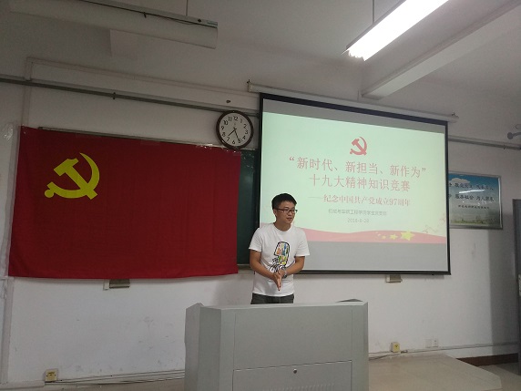 宣誓仪式结束后,进入“新时代、新担当、新作为”十九大精神知识竞赛环节。竞赛分为必答题、抢答题和简答题三个部分,学生党员分成两组进行比拼。两组同学个个摩拳擦掌,跃跃欲试,团队之间奋力合作,争先恐后。第一小组虽然在必答题过后暂时落后,但在抢答题部分踊跃抢答,后来居上,拉开了40分的差距。第二小组也不甘示弱,不仅在简答题部分再次追平比分,更在加时赛中表现突出,赢得最终胜利。如火如荼的知识竞赛将活动氛围推向顶点。党员们通过比赛深入学习了十九大精神,提升了政治素养和理论水平,增强了团队协作能力和凝聚力,寓教于乐,获益匪浅。