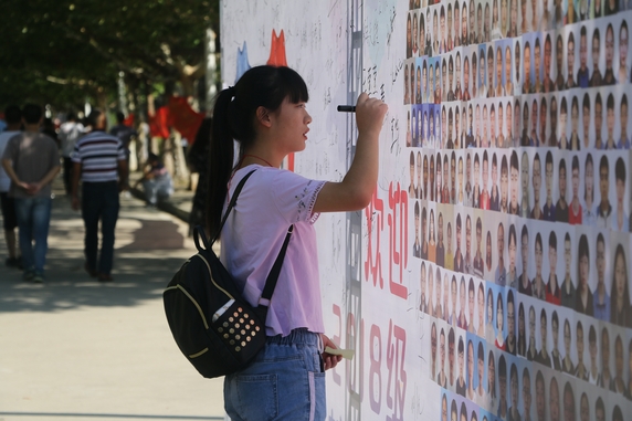 新生不仅可以在照片墙上,签上自己的姓名,写下对未来的期许,还可以和家长在照片墙前合影留念,用这样一种特别的方式,记录下自己来到大学的第一天。“今天是我上大学的第一天,学长学姐看到我们真的很热情,虽然没有在照片墙上找到我的照片,不过可以在签名墙上留下我的名字呀,成为我大学第一天的独特记忆。”来自文学与教育学院汉语言文学专业的龚振亚说道。