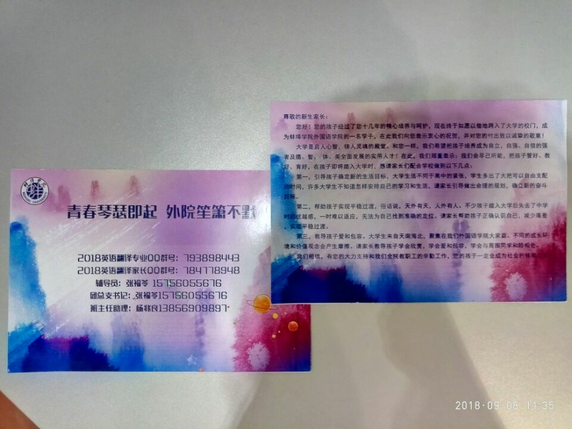 此次外国语学院的迎新工作彰显特色,工作十分用心。前期精心准备的明信片也在迎新中发给了新生家长,同时建立了新生家长QQ群,邀请新生家长入群,加强家长和学院老师的联系,以便共同做好学生的培养与教育工作。(撰稿:吴婷婷;编审:黄灿 袁飞)