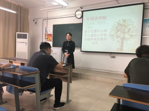9月19日上午,外国语学院公外第二教研室在B213召开本学期第一次教研活动,研讨艺术类、对口类大学英语如何利用泛雅平台和学习通实施翻转课堂教学改革,如何修订以翻转课堂为主导的《大学英语II》、《大学英语III》课程教学大纲。外国语学院副院长赵生学参加了此次活动,并对翻转课堂教学中一个重要环节“形成性评价”做了经验分享。