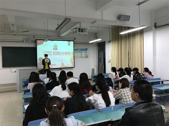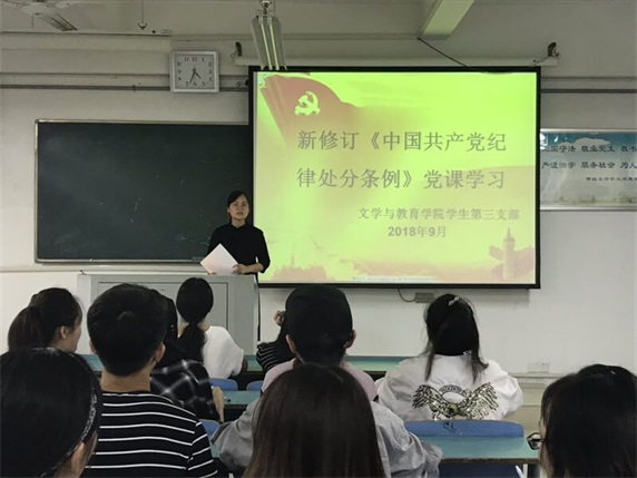 为贯彻学院纪委文件指示精神,切实提高学生党员廉洁自律意识,文学与教育学院学生第一、二、三党支部分别于2018年9月27、28日 通过党课形式学习最新通过的《中国共产党纪律处分条例》。