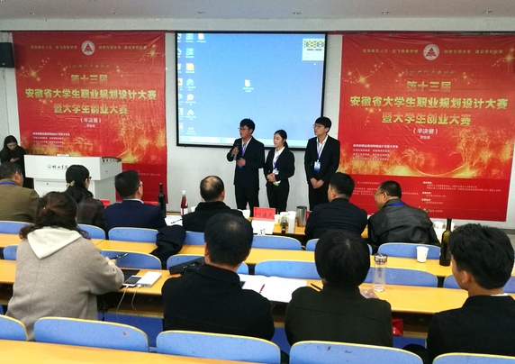 2018年11月17日,以“规划精彩人生,放飞青春梦想;创新引领未来,建设美好安徽”为主题的“苏滁现代产业园杯”第十三届安徽省大学生职业规划设计大赛暨大学生创业大赛半决赛(皖北赛区)在皖西学院成功举办。来自皖北地区30所高校的30名职业规划组选手和26支创业组团队,分别在二个赛场展开了激烈角逐。我校机械与车辆工程学院的张汉清《果予果酒》创业团队和外国语学院的胡顺利同学分别代表学校参加了本次皖北地区创业组与职业规划组半决赛。