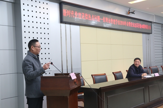 为庆祝改革开放40周年,加强蚌埠市从事伦理道德教学和研究的同行交流合作,深入探讨新时代伦理道德热点问题,2018年11月16日,新时代伦理道德热点问题—蚌埠市伦理学会2018年会暨庆祝改革开放40周年学术研讨会在蚌埠学院召开,此次会议由蚌埠市伦理学会和蚌埠学院马克思主义学院联合举办。蚌埠学院党委委员、纪委书记赵大为和蚌埠市社科联主席胡兵应邀出席,会议由蚌埠学院科研处长武杰主持。学会会长、蚌埠学院党委委员、宣传部长李荣,学会副会长、蚌埠医学院马克思主义学院院长武余芹,学会副会长、安徽财经大学马克思主义学院院长张斌,学会副会长、安徽科技学院马克思主义学院党总支书记李森林,学会常务副会长、蚌埠学院马克思主义院长邬旭东以及学会全体会员参加了会议。