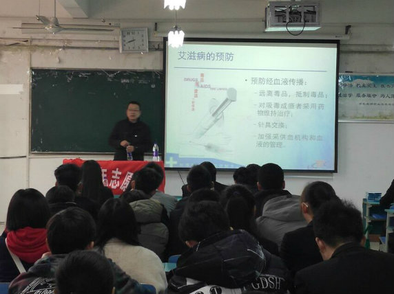 市疾控中心主任马凤昌结合自己多年的工作经验向同学们讲述了吸毒对吸毒人员的身体、家庭以及社会所造成的危害。马凤昌指出,吸毒会使吸毒人员身体的各个器官受到严重损害,不少吸毒人员因为筹集毒资,落得倾家荡产。更有甚者,吸毒后产生幻觉、幻听,最终做出自残以及危害社会的行为。讲座中市疾控中心潘阳特别谈到,注射吸毒是艾滋病毒传染的一条重要途径。“不少吸毒人员喜欢采用肌肉或皮下静脉注射毒品,而这些注射毒品所使用的针头因为交叉使用或者不注意消毒等原因往往留有艾滋病毒,这便成为了艾滋病毒传染的一个重要途径。而许多HIV阳性吸毒者主动参与嫖娼卖淫或有偿献血活动,更是艾滋病毒传播蔓延的主要原因。最后蚌埠市经济开发区疾控办曹俊秋详细介绍了艾滋病防治的流行现状及特点、如何对艾滋病患者提供帮助等知识,他强调青年学生要培养健康文明的生活方式,自觉抵制不良习惯,以避免感染和传播艾滋病病毒行为的发生。