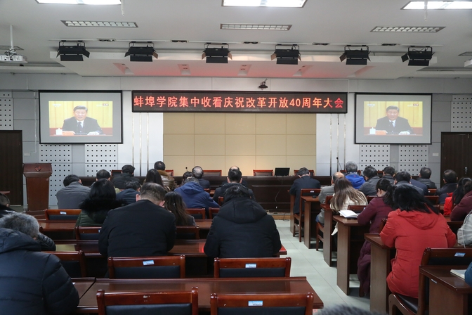 12月18日,庆祝改革开放40周年大会在人民大会堂隆重举行。中共中央总书记、国家主席、中央军委主席习近平出席大会并发表重要讲话。蚌埠学院领导班子全体成员带领机关部门全体工作人员观看了大会直播,马克思主义学院、团委、后勤集团组织了集中观看,其他单位师生也通过电视、网络等各种方式收看了大会盛况。
