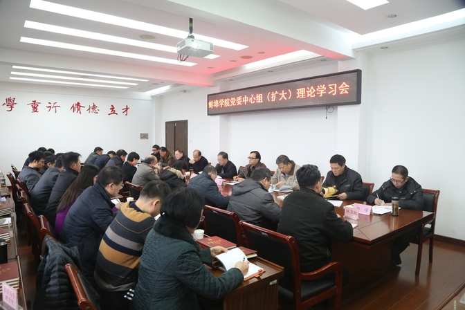 12月19日,蚌埠学院在行政楼第二会议室召开党委理论学习中心组(扩大)会议,认真学习习近平总书记在庆祝改革开放40周年大会上的重要讲话。党委理论学习中心组成员,各职能部门主要负责人,各二级学院、电大、后勤集团党政主要负责人参加学习。会议由党委书记刘泽功主持。