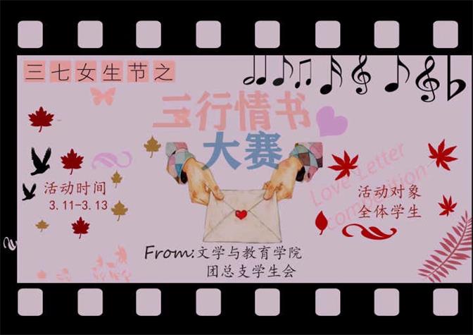 “挥笔泼墨愿为你书锦绣山河,花前月下愿为你唱几世情歌。”情书,是爱意的寄托;情书,是情感的表达。为了丰富同学们的校园文化生活,增强校园文学气氛,3月12日,文学与教育学院团总支举办了女生节系列活动之“三行情书”。本次征文大赛面向蚌埠学院全体在校学生,旨在以三行情书的形式,鼓励同学们表达自己的心声,传递真心、传递爱。