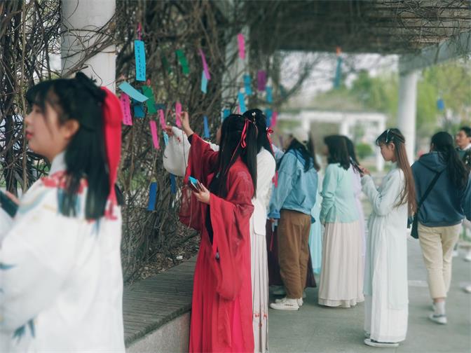 欣赏完优美的汉舞,踏青赏红的环节来到了。湖水粼粼,春风正好,同学们纷纷将写有自己心愿的红布条与五彩色纸系于树上,微风吹动各色布条,别有一番春日雅趣。占花令与欢乐挑菜的活动让气氛瞬间活跃了起来;茶艺与琴声的相伴又为在场同学推开了一扇古韵风雅的大门。活动的最后,大家一起品尝美味的百花糕,用舌尖感受春天。
