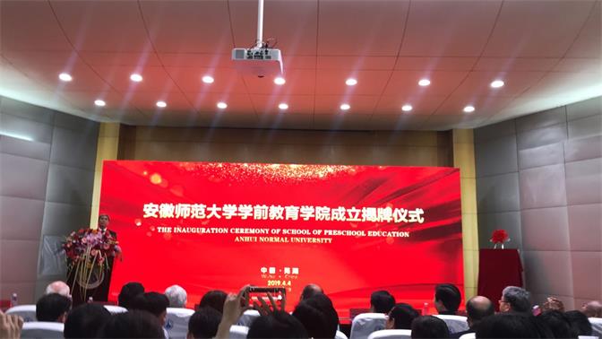 2019年4月4日下午,安徽师范大学学前教育学院成立揭牌仪式暨2019“教育与童年幸福”国际学术研讨会在安徽师范大学赭山校区田家炳楼隆重举行。成立学前教育学院,是贯彻党的教育方针、落实中央省委决策部署、促进教育公平的重要举措,是服务经济社会发展、深化教育供给侧改革、打造教师教育品牌的重要探索。