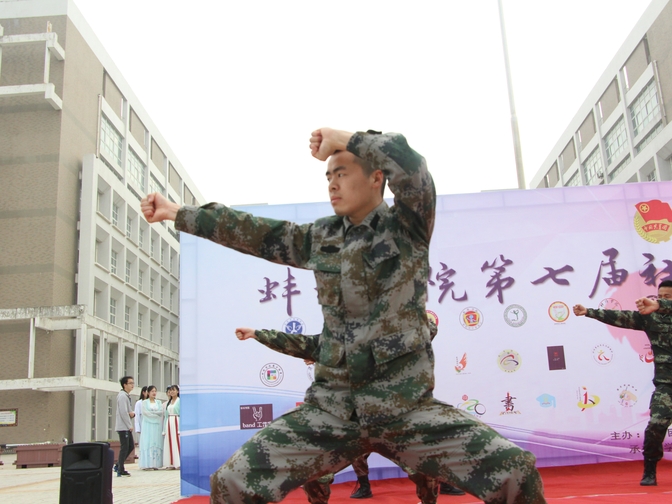 “贯耳冲击、抓腕砸肘、挡臂掏腿……”一招招动作干净利落、整齐划一,数名身着迷彩服、打着擒敌拳的同学在第七届社团文化节开幕式上英气逼人、魅力四射,赢得了在场观众的一片喝彩。据了解,该节目是由刚成立不久的八一社团表演的。