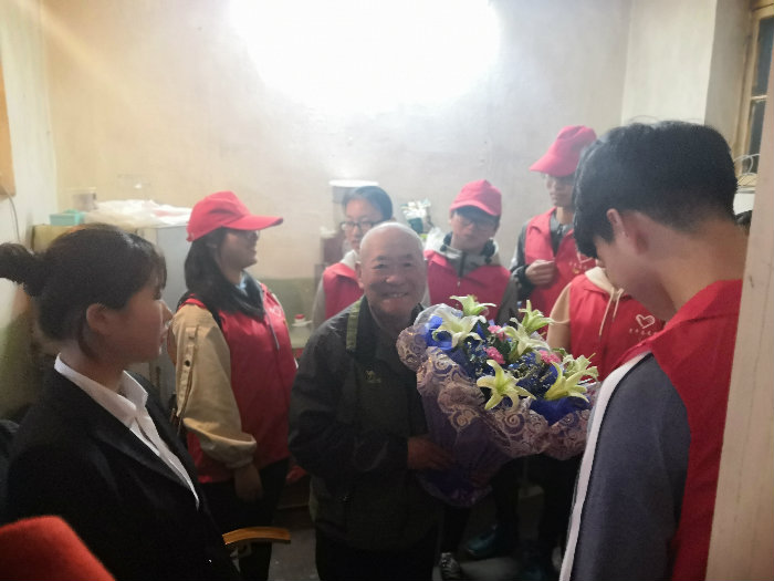 4月28日下午,冒着淅沥小雨,理学院青年志愿者们来到了新光联工委办公室,同新光联工委工作人员开展以“青春百年 放飞梦想”为主题的“五四”青年诗歌朗诵活动。工作人员和志愿者们正装上台,他们或激昂,或深情,或柔缓,无一不表达自己对祖国的热爱,营造出朝气蓬勃、积极向上的良好氛围。接着,志愿者们分成两组,在新光联工委的工作人员的带领下,捧着鲜花,带着崇高的敬意,来到困难党员家中,慰问老党员。在这里,老人给志愿者讲述历史的过往,同时志愿者表达了对老人的美好祝愿,看到老人和蔼的笑容,志愿者们的心都被温暖填满了。最后工作人员带领所有青年志愿者们来到了辖区百岁老党员杜庆芳家中,给老人过百岁生日,同庆“两个一百年”。在这里,志愿者给老人带来鲜花蛋糕,为老人鼓掌庆贺并送上真挚的祝福,最后杜庆芳嘱咐青年:“孩子们,你们要继承和发扬五四精神,用自己的实际行动践行青年学子的责任与担当”。