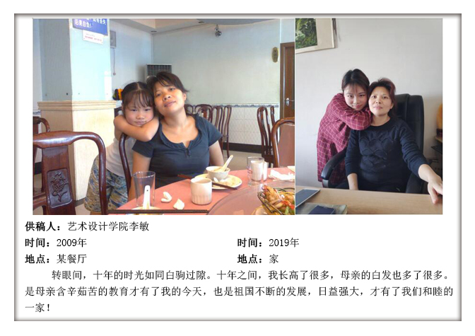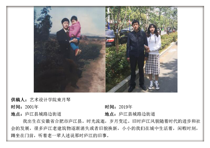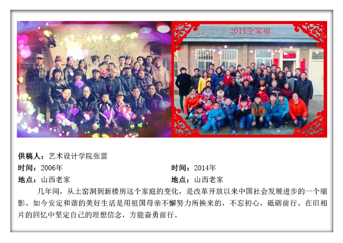 本次征集在师生中引起了强烈反响,师生们纷纷踊跃投稿,将本人珍藏的具有历史意义的老照片进行对比翻拍,艺术设计学院团总支共收到作品62份。每一张老照片,都记录着过去的印记与回忆;每一张照片的背后,都有一段光阴的故事。心中有阳光,脚下有力量——照片背后的深意、蕴藏的情感,或许正是激励我们一往无前,为向往的生活永不懈怠地奋斗的初心。