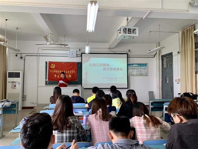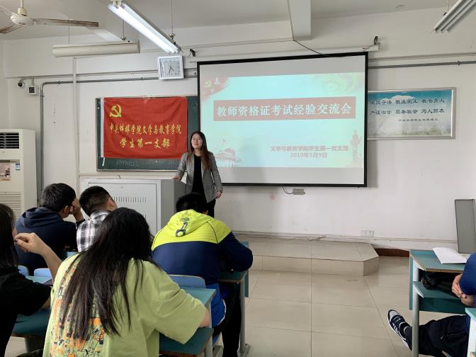 为贯彻落实习近平新时代中国特色社会主义思想和党的十九大精神,深入推进“两学一做”学习教育常态化制度化,且正值五四运动一百周年之际,为学习新时代青年如何发扬五四精神,同时进一步深入群众,关心同学,争做合格党员,在考研复试结束,教师资格证面试来临之际,文学与教育学院学生第一党支部于2019年5月9日在教学楼B324开展主题党日活动——努力学习,提高素质,争做奋进新时代的追梦人。活动分为理论学习和经验交流两个阶段,党支部书记潘兰香老师组织了这次活动。