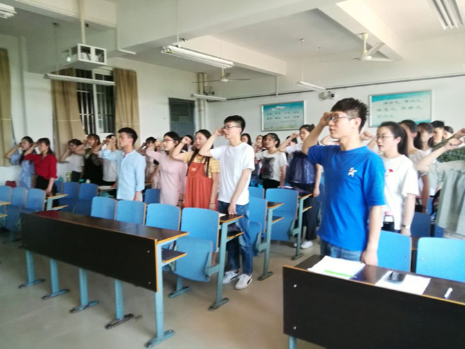 本次活动采用讲座的形式展开,外国语学院团总支书记兼学生支部委员王秀梅担纲主讲。这天中午,学院学生支部全体成员齐聚教学楼A215教室。讲座伊始,王秀梅询问大家入党的动机是什么,引发了同学们的热烈议论。随后,她以入党誓词为切入点,要求大家回望自己的入党的初心。王秀梅带领大家回顾入党誓词的发展历程,展示了土地革命时期、抗日战争时期、解放战争时期、建国时期和改革开放时期各个版本的誓词,并结合当时的历史背景,详细解读了誓词背后的内涵。脉络清晰、生动形象的讲解,引导大家从誓词中挖掘历代共产党人的责任感和使命感,铺开了历代共产党人为了社会主义革命和建设事业无私奉献砥砺奋斗的历史画卷。最后,王秀梅带领全体参学同学,在鲜红的党旗再诵读一次入党誓词。同学们站姿挺拔、声音洪亮,党旗下的宣誓表达了他们对党对祖国的深深热爱和勇担时代责任的无限热情,不忘初心,不辱使命,在他们的心底打上了深刻的烙印。