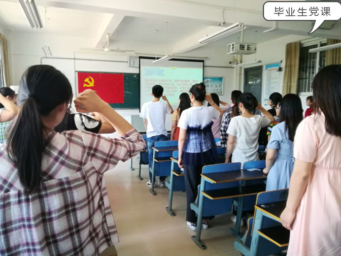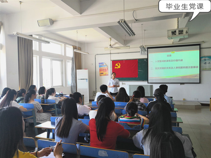 毕业生党课教育:5月23日下午2点,全体毕业生党员在教学楼F505教室,接受了在校期间最后一次党课教育,外国语学院党总支书记赵睿,学生支部宣传委员王秀梅老师授课,要求毕业生党员要率先垂范,以身作则,切实发挥党员的先锋模范作用,为毕业生文明离校营造良好的氛围,同时王秀梅提醒广大毕业生党员要按时、按要求将本人党员关系落户,并参加新党组织的各项活动,按期交纳党费,展现外国语学院毕业生党员的良好精神风貌。