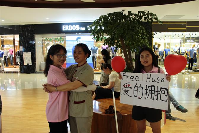 院级国情社情观察团——放下手机迎接拥抱“FreeHugs实践队”。自7月4号起,实践队员们怀着热情和期待,准备这场充满信任与温馨的活动。7月5号,实践队员们穿上可爱的玩偶服,拿上自制宣传牌,在蚌埠市银泰、万达广场,期待着和来来往往的人进行一次温情的拥抱。这个活动不仅拉近了人们心与心的距离,更多的传达了温情和关怀,感受心灵的freehug。