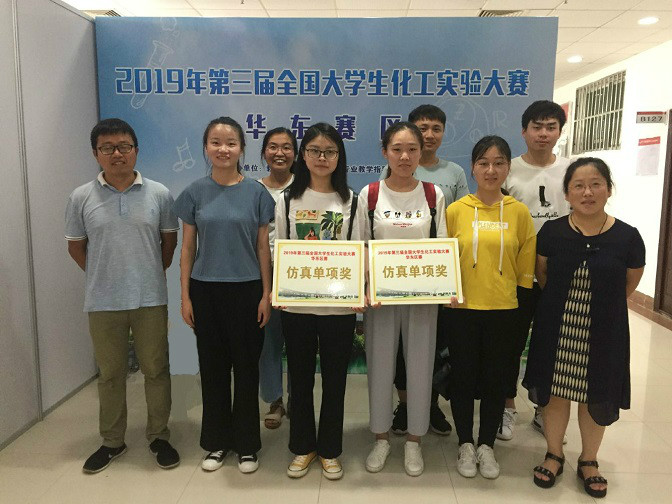 材化学院对这次比赛高度重视,积极筹划,精心组织,制定了详细的备赛计划,进行了精心的准备,并指派秦英月、刘沐鑫和石春杰3名教师全程指导。在两个多月的集训期间,经院内选拔出的6名参赛同学夜以继日地进行复习和演练。在比赛过程中,面对华东地区浙江大学、华东理工大学、南京工业大学等名校的竞争对手,同学们沉着冷静,有条不紊地完成了各项比赛环节,通过第一轮理论考试筛选后,进入第二轮的实验仿真比赛。最终两组得分分别为75.9分和72分,实验仿真比赛的平均得分为49分,两组选手均获得化工单元仿真单项奖。