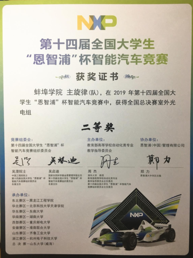 8月22日-25日,第十四届“恩智浦”杯全国大学生智能汽车竞赛全国总决赛在山东大学威海校区举行。经过8大赛区的层层选拔,全国共有185所高校的391支队伍1362名大学生挺进全国总决赛。蚌埠学院电子与电气工程学院夏宏兵、王强老师指导的史诗云、田乐、程西龙、余夕林和彭元堃组成的“主旋律”队,在室外光电组赛项中,与清华大学、哈尔滨工业大学等高校学生同台竞技,经过激烈角逐,最终取得突破,荣获全国总决赛二等奖。