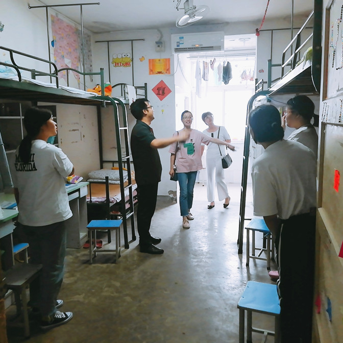 赵生学一行逐一检查了女生宿舍3-4号楼,重点检查了2019级专升本学生的宿舍。与往年不同,本年度专升本学生皆就读于从其他专科学校,对他们而言,蚌埠学院是完全陌生的学习生活环境。本年度学院学生宿舍集中分布在高层,水压较低,部分同学遇到用水困难。赵生学仔细查看了各宿舍的用水情况,并关切地询问同学们是否熟悉了学院环境,生活是否有不便之处。杨小云对宿舍用品的摆放、垃圾的处理和电器的使用等给予了细致的指导。