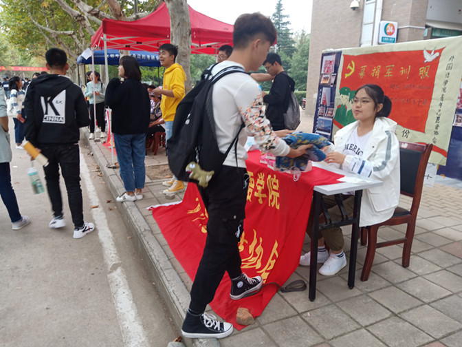 10月10日,外国语学院青年志愿者协会在校园主干道举办“‘衣’往情深,与爱同行”军训衣物收集捐赠活动,旨在实现军训服的循环利用;在发扬勤俭节约优良作风的同时传递爱心,传播公益。
