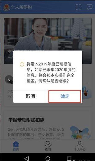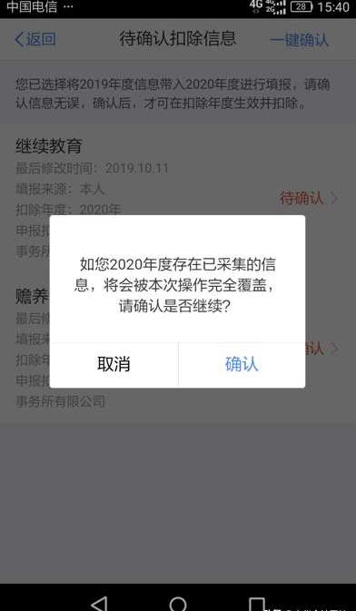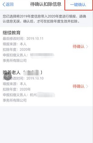 2019年已填过专项附加扣除, 点击“确认2020年度专项附加扣除”,系统跳出提示,点击“确定”,核对信息;如有“修改”,可以点击进入“修改”,信息确认后点击“一键确认”;系统再次提醒,点击“确认”。此时,2020专项附加扣除申报完成。如果需查看记录,可以点击“查询”——我的记录“专项附加扣除填报记录”——切换年度查看。