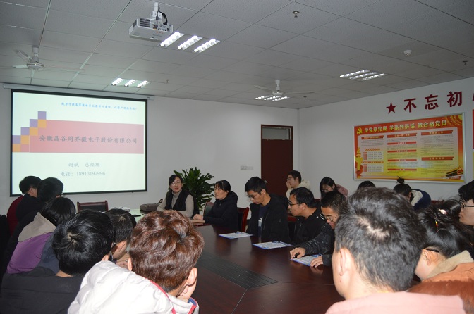 1月7日,应电子与电气工程学院邀请,安徽晶谷周界微电子股份有限公司总经理谢斌一行3人,就2020届电子信息工程专业毕业生的毕业实习、毕业设计和就业工作,开展企业宣讲和毕业生遴选,院长王艳春、辅导员许灵和电子信息工程专业部分毕业生参加了会议。