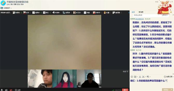 根据实时监控和督导反馈,本次线上开题答辩工作庄重而严肃,师生讨论热烈,气氛非常活跃,达到了开题把关的目的。简而言之,本次线上开题答辩是一次有益而成功的尝试,虽是疫情防控期间不得已而为之,但由于组织精心、计划完善,效果良好,达到了教学目的。开题答辩结束后,文学与教育学院2020届毕业设计(论文)工作将进入下一阶段,组织学生在修订完善开题报告的基础上,进行设计(论文)初稿写作。(撰稿:何蕾;编审:黄灿)
