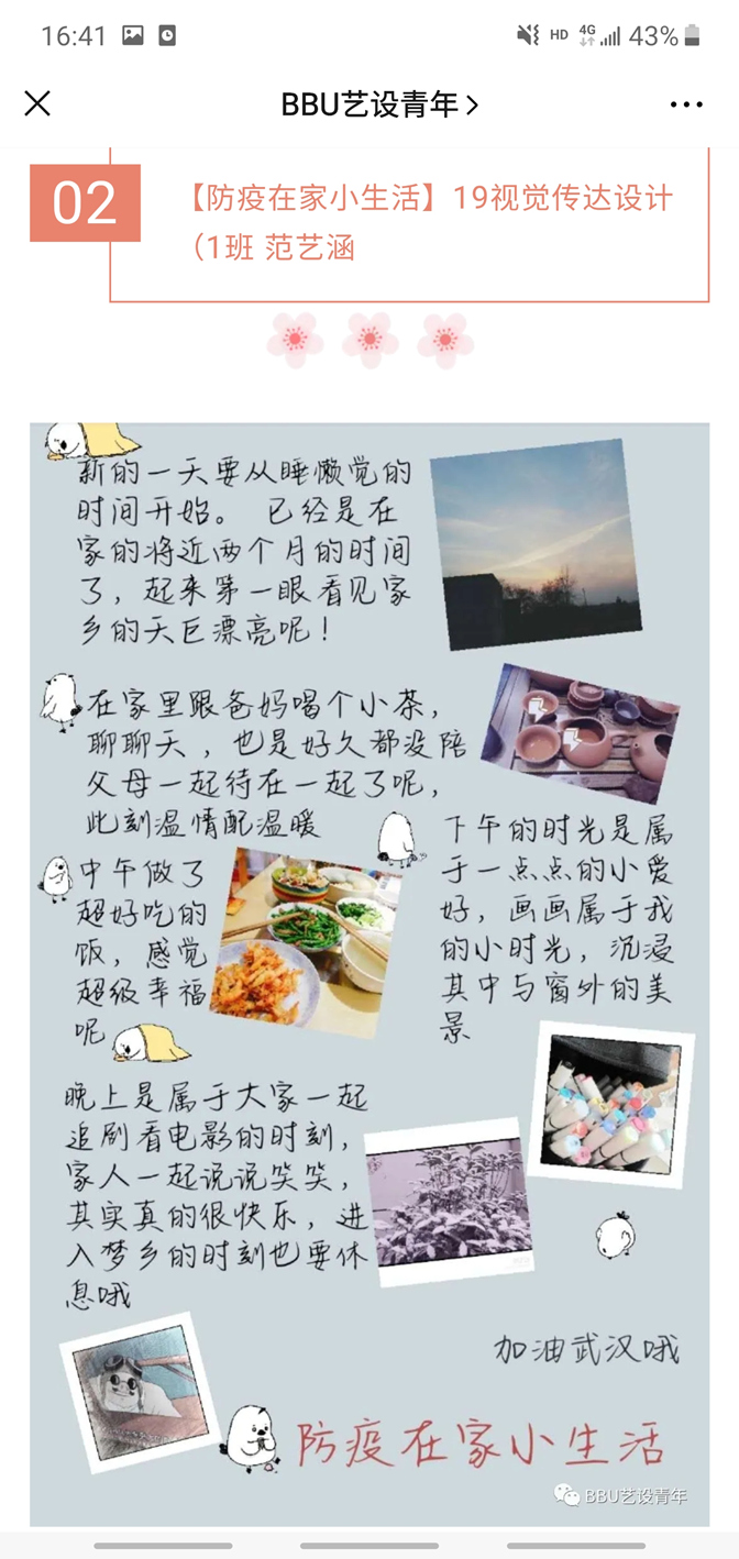3月以来,艺术设计学院团总支微信官方公众号“BBU艺设青年”发布了“我的宅家时光”线上活动,呼吁同学们解锁寒假新技能,分享自己学习技能的故事经历,积极投稿。