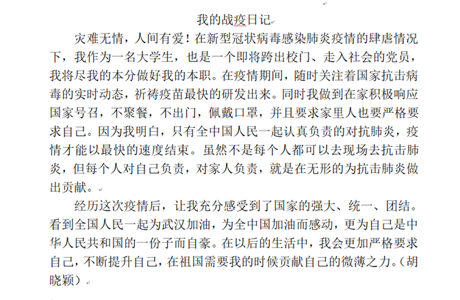活动得到各支部党员同志的积极响应,他们纷纷向支部提交自己的战疫日记,有的叙述疫情期间自己的志愿活动,有的表达对一线工作人员的敬佩之情,有的讴歌祖国的伟大以及身为中国人的骄傲与自豪,有的感慨自己无法深入一线救死扶伤……同志们的心声一一体现在了战疫日记中。