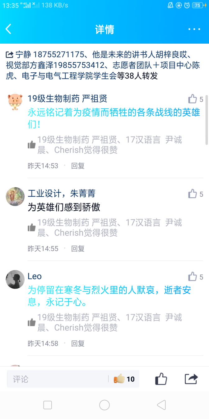 “鸣呼哀哉,魂兮归来!问世之何以当不朽,英雄之魂立苍穹。血肉之躯救中华,胜利之实换民生。沉痛悼念,英雄走好!”“向英雄致敬,请一路走好。逝者安息,精神长存。”师生在校团委官微留言中缅怀英雄。校团委官Q也在发布公告后收到来自师生的留言,他们纷纷用真挚的语言和深沉的情感表达着对祖国逝世同胞的万千哀思。此外,各院团总支自发在今日上午10时发布哀悼图文,共同哀悼烈士、同胞。