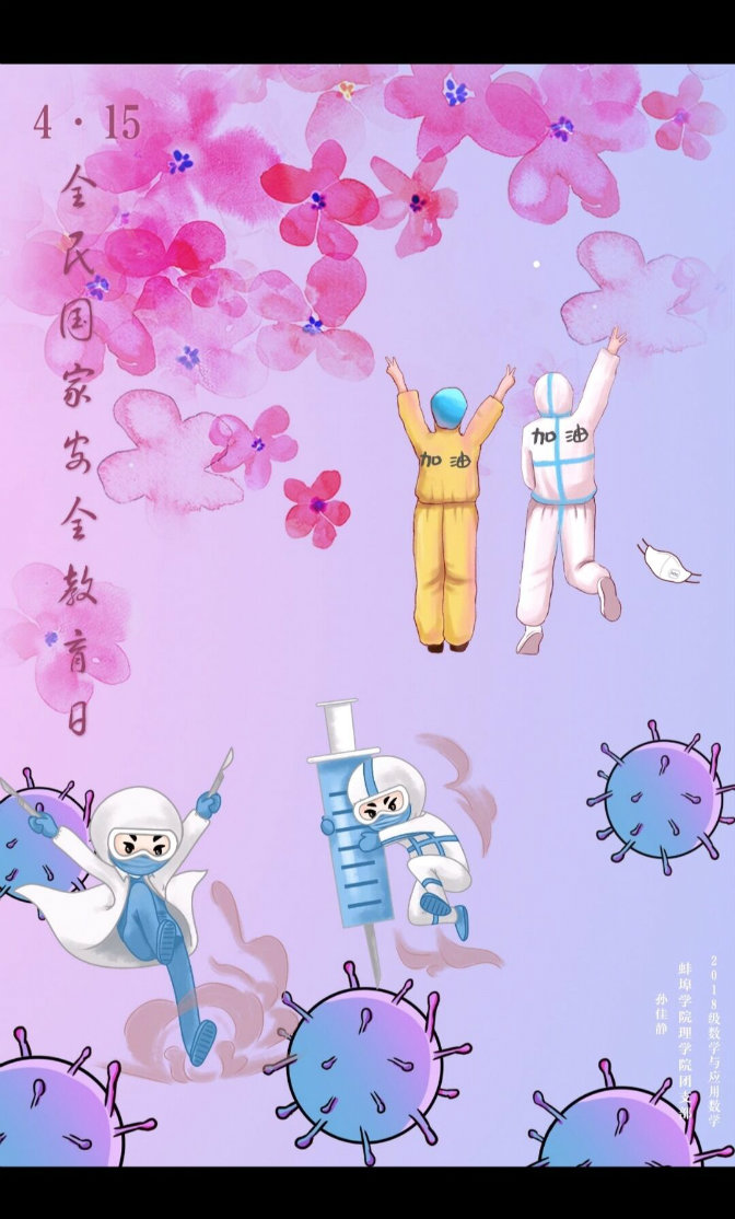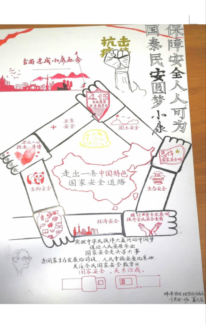 4月8日至14日,在“理院小栈”公众号上开展了以“防疫收尾不放松,国家安全不能忘”为主题的手抄报大赛,将竞赛与学生第二课堂相结合,吸引了百余名学生参加。其中唐雯同学的作品主要以简笔画的形式呈现,明确了全民国家安全教育日的主题,并在其海报中列举出中国国民应该做的事和中国国民禁止做的事,对比鲜明,海报中亦有形象的图画,其主要表达的思想是“在疫情面前,全国人民万众一心,团结一致,共抗疫情,待春暖花开、战‘疫’成功之时,离实现我们2020年的目标会更进一步”。