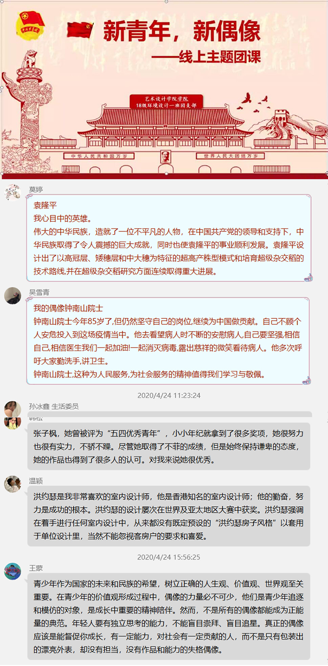 各团支部积极响应艺术设计学院团总支的号召,在防控疫情特殊时期,精心组织开展线上团日活动。各支部团支书结合PPT、视频以及音频等多媒体手段开展活动,内容涵盖以下几个方面:一是学习《习近平总书记给北京大学援鄂医疗队全体“90后”党员的回信》精神;二是“新青年·新偶像”大讨论,学习坚守在最前线的医护人员、坚守在基层的党员等典型事迹,以感受青年榜样、国家力量;三是讲述抗疫志愿者工作者感人的故事,从榜样精神学会担当与成长。