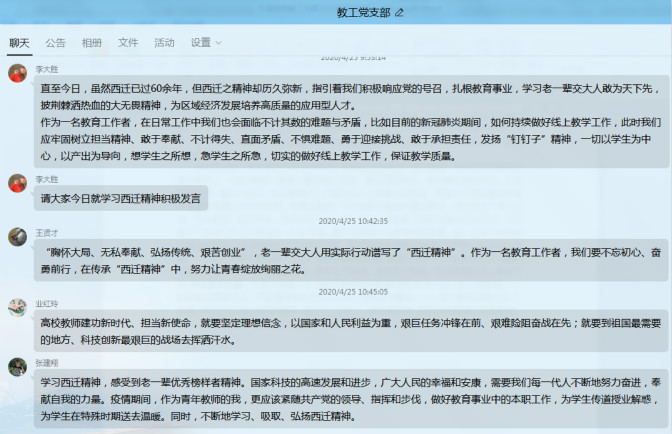 研讨活动是由教工党支部书记李大胜发起,前期已上传各类“西迁精神”资料供党员教师们进行学习。“西迁精神”是老一辈教育工作者,服从国家安排,举校搬迁西部地区,从此扎根当地,建设大西北,争创高精尖。交通大学从上海搬迁至西安,是服务于国家整体教育资源重新布局工作的总目标,是勇往直前,开拓进取的精神财富的象征,被总结为“胸怀大局,无私奉献,弘扬传统,艰苦创业”十六字。学院全体教职工党员通过认真学习后在群内各抒己见,充分表达了对老交大人不畏艰辛、攻坚克难、勇于开拓的大无畏精神的敬佩,每一位党员都用自己真诚的语言,由衷地表达出朴实的感悟。例如有的党员教师说:“目前的新冠肺炎疫情期间,作为一名教育工作者如何持续做好线上教学工作,发扬“钉钉子”精神,一切以学生为中心,以产出为导向,想学生之所想,急学生之所急,切实做好线上教学工作,保证教学质量。”有的党员教师说:“在当前疫情防控的特殊时期,作为一名一线人民教师,应积极响应国家号召,严格遵守党和国家的各项防疫规定与要求,努力做好本职工作。”等等,诸如此类的发言表现出学院教师党员群体,有担当,有能力,富有责任感,拥有进取精神的积极面貌。