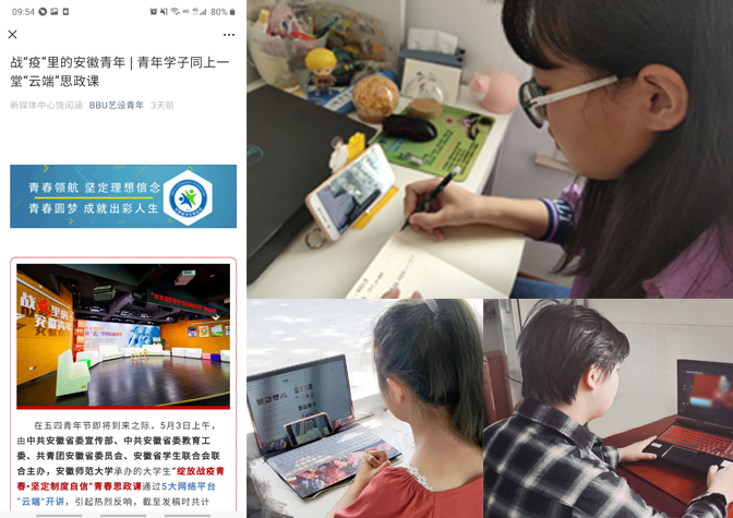 5月3日上午,由中共安徽团委宣传部、中共安徽省委教育工委、共青团安徽省委员会、安徽省学生联合会联合主办,安徽师范大学承的大学生“绽放战疫青春·坚定制度自信”青春思政课在各大网络平台“云开讲”,艺术设计学院团总支组织各班级团支部收看此档节目并交流心得。