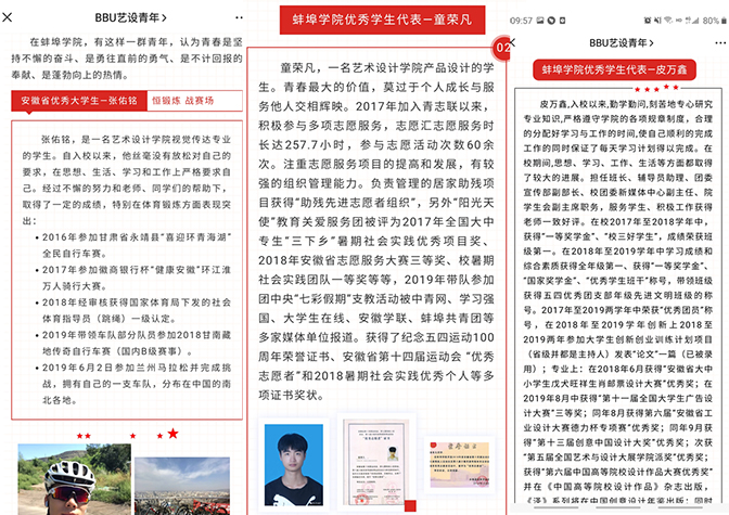 为表彰艺术设计学院2019-2020年度获得“安徽省优秀大学生”、“蚌埠学院向上向善好青年”、“蚌埠学院十佳大学生”、“蚌埠学院优秀大学生”及2020年“五四评优”各类奖项的优秀学生典型,艺术设计学院团总支在微信公众号(BBU艺设青年)上以《未来之路,活出自己的态度!》为题进行了个人和集体的先进事迹宣传,激励广大团员、团干部奋发有为、再创佳绩。