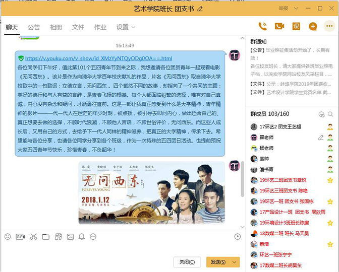 4月30日,艺术设计学院团总支组织团员青年线上观看了电影《无问西东》。作为向清华大学百年校庆献礼的作品,片名《无问西东》取自清华大学校歌中的一句歌词:立德立言,无问西东。四个截然不同的故事,却指向了一个共同的主题:美好的德行和与人有益的言辞,是青春飞扬的根基。每个人都面临纷繁的选择,唯有对自己真诚,内心没有杂念和疑问,才能勇往直前。