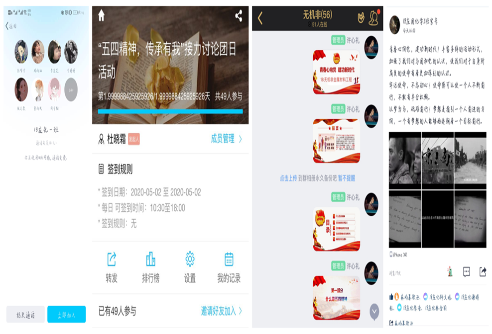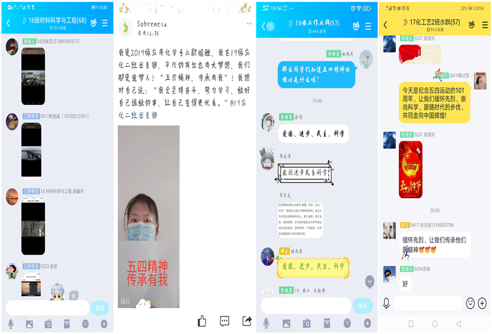 5月起,材料与化学工程学院团支部以“青春之我,奋斗之我”开展主题团日活动,并就习近平总书记在五四青年节到来之际对新时代青年的寄语展开热议,各支部广泛开展了线上经典诵读、读书会、红色经典观影、祭奠革命英烈等活动,并依托新媒体平台,广泛开展“五四精神、传承有我”主题网络活动。同时以团支部为单位开展“五四精神、传承有我”接力讨论。广大团员青年集中发声,发挥线上平台宣传优势,引导团员青年将先进性和担当精神延伸到网上。大家纷纷表示,要牢记习近平总书记寄语,继承和发扬五四精神,不畏艰险、冲锋在前、真情奉献,展现当代中国青年的担当精神。(撰稿:陆晓石;编审:黄灿)
